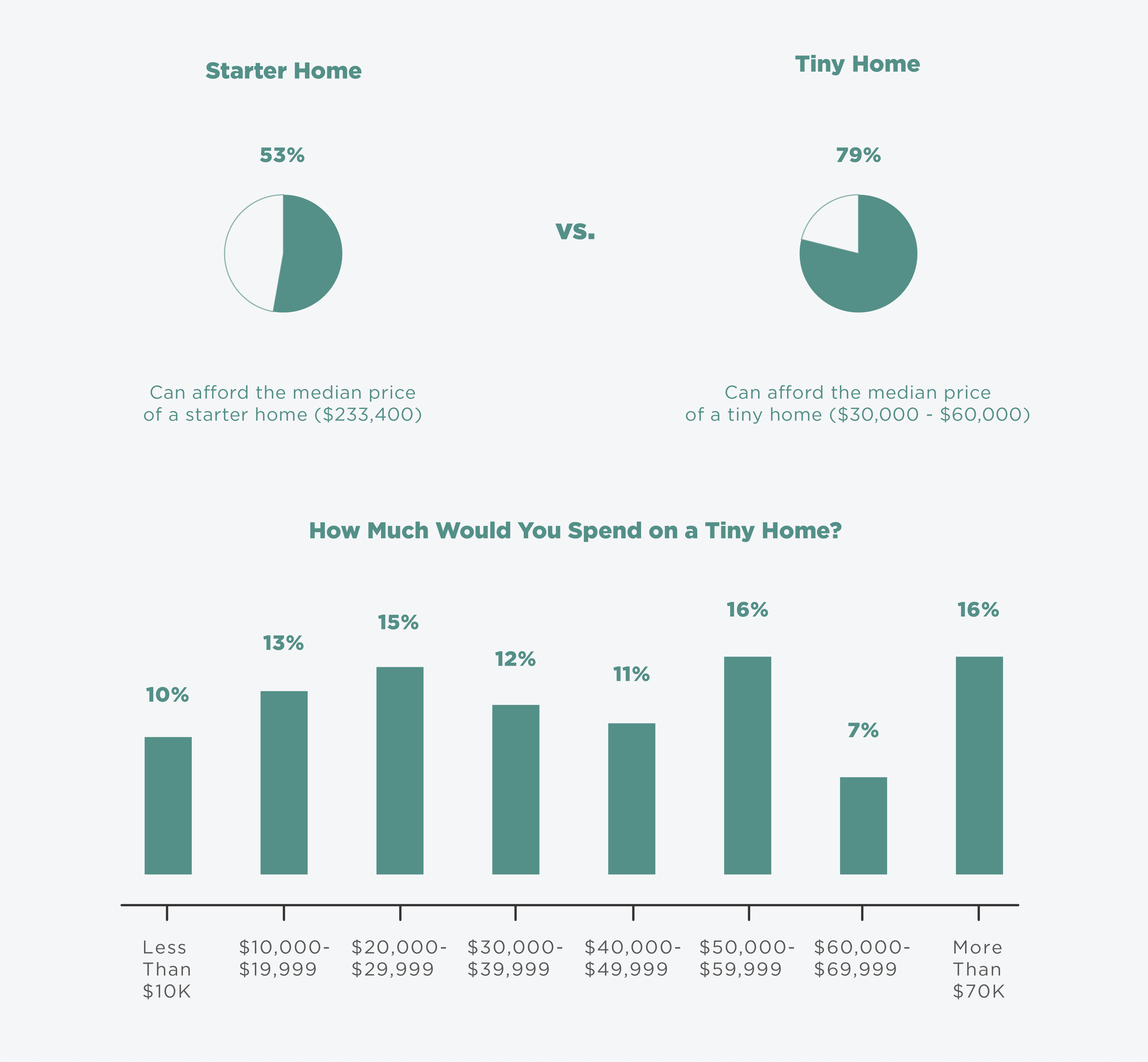 The price to purchase or build a tiny home can vary and depends on a number of factors. Most tiny homes cost between $30,000 to $60,000 while the median price for a starter home is $233,400, according to the National Association of Realtors. Exactly half of respondents say they would spend less than $40,000 on a tiny home and 79% say they would be able to buy or finance a tiny home rather than a traditional starter home.