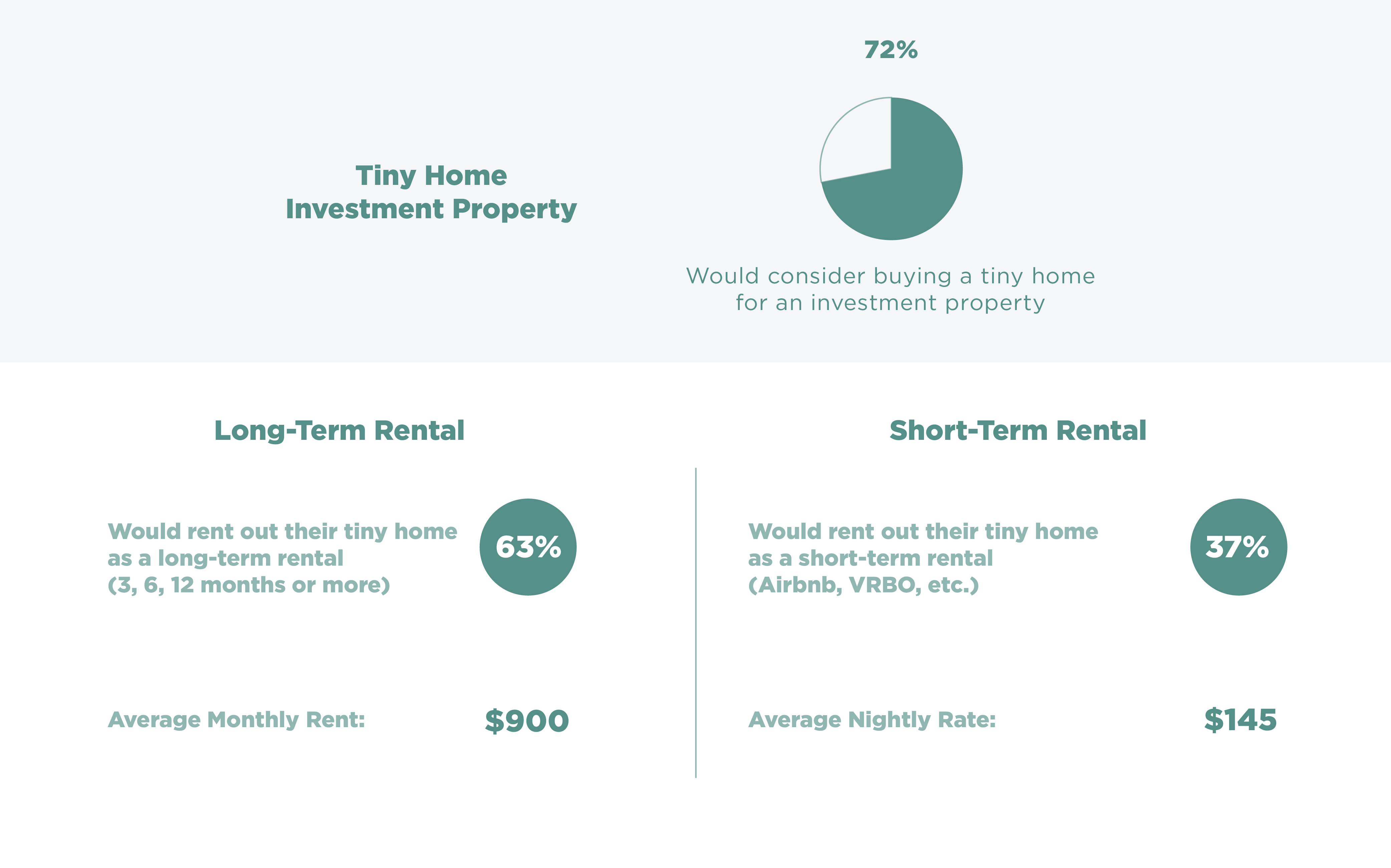 With a low cost to build and maintain, tiny homes could bring big profits for property investors. According to respondents, 72% would consider buying a tiny home to serve as an investment property. Among those, 63% say they would rent out their tiny home as a long-term rental while 37% say they would rent their tiny home as a short-term rental. On average, respondents say their ideal monthly rent would be set at $900 per month for a long-term rental and $145 per night for a short-term rental.