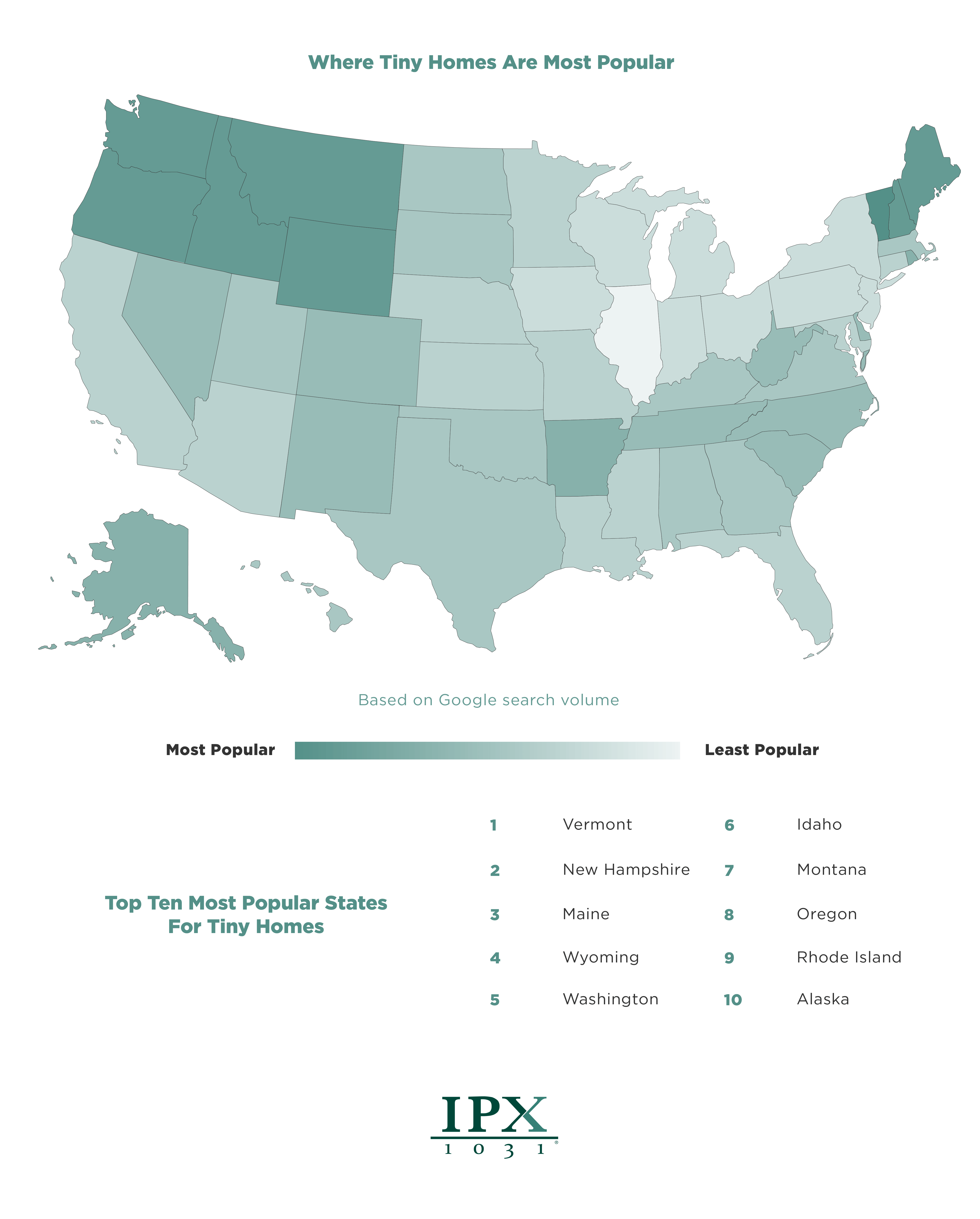 The results show that tiny homes have seen the most interest in rural states such as Vermont, New Hampshire, Maine, Wyoming and Washington. Illinois, Pennsylvania, Ohio and New York showed the least interest in searches for tiny homes.