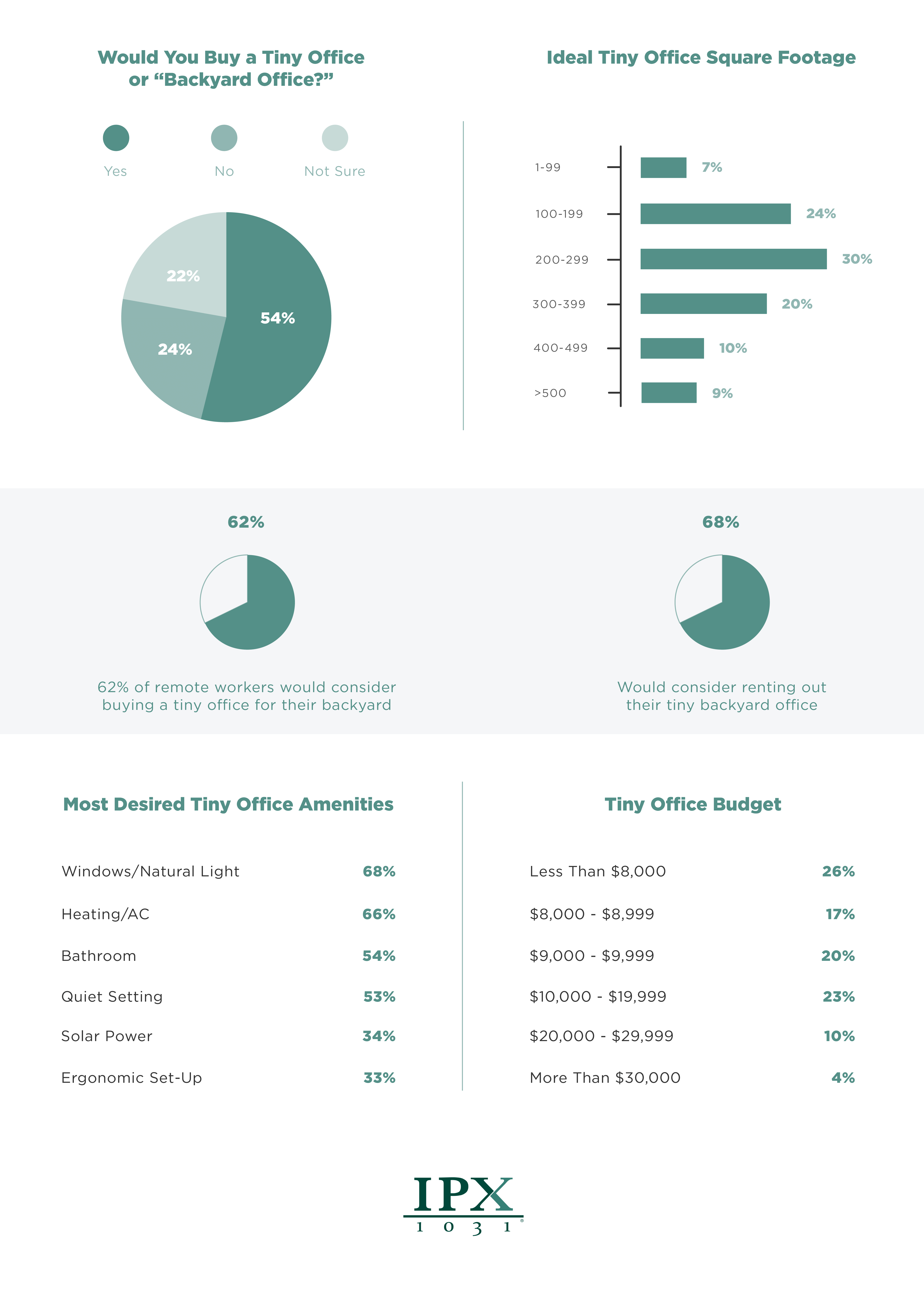 With many Americans adapting to remote work or working from home, the concept of a tiny office (or a “backyard office”) is an appealing alternative to working inside a home office, kitchen or living room. In fact, more than half (54%) say they would buy a tiny office and 62% of remote workers would consider buying one. Ideally, more than a quarter of respondents say they would spend less than $8,000 on a tiny backyard office.