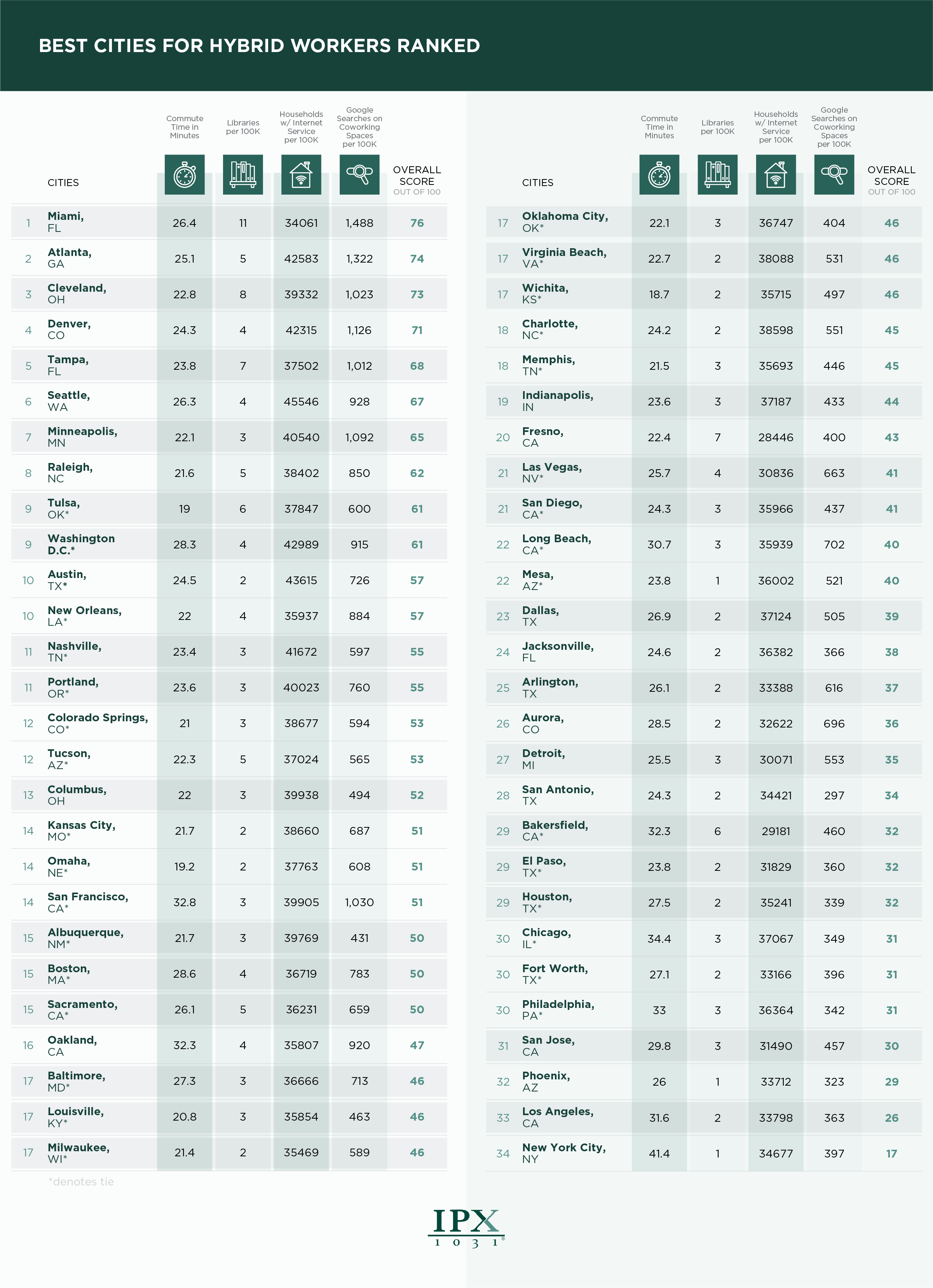 Coming in at #1 for the best city for hybrid workers is Miami. The city earned a top score in two categories. It has 11 libraries per 100,000 people, the highest of all ranked cities, and has the most Google searches for coworking spaces. Miami also boasts a shorter commute time of 26.4 minutes which helped land it in the top spot.