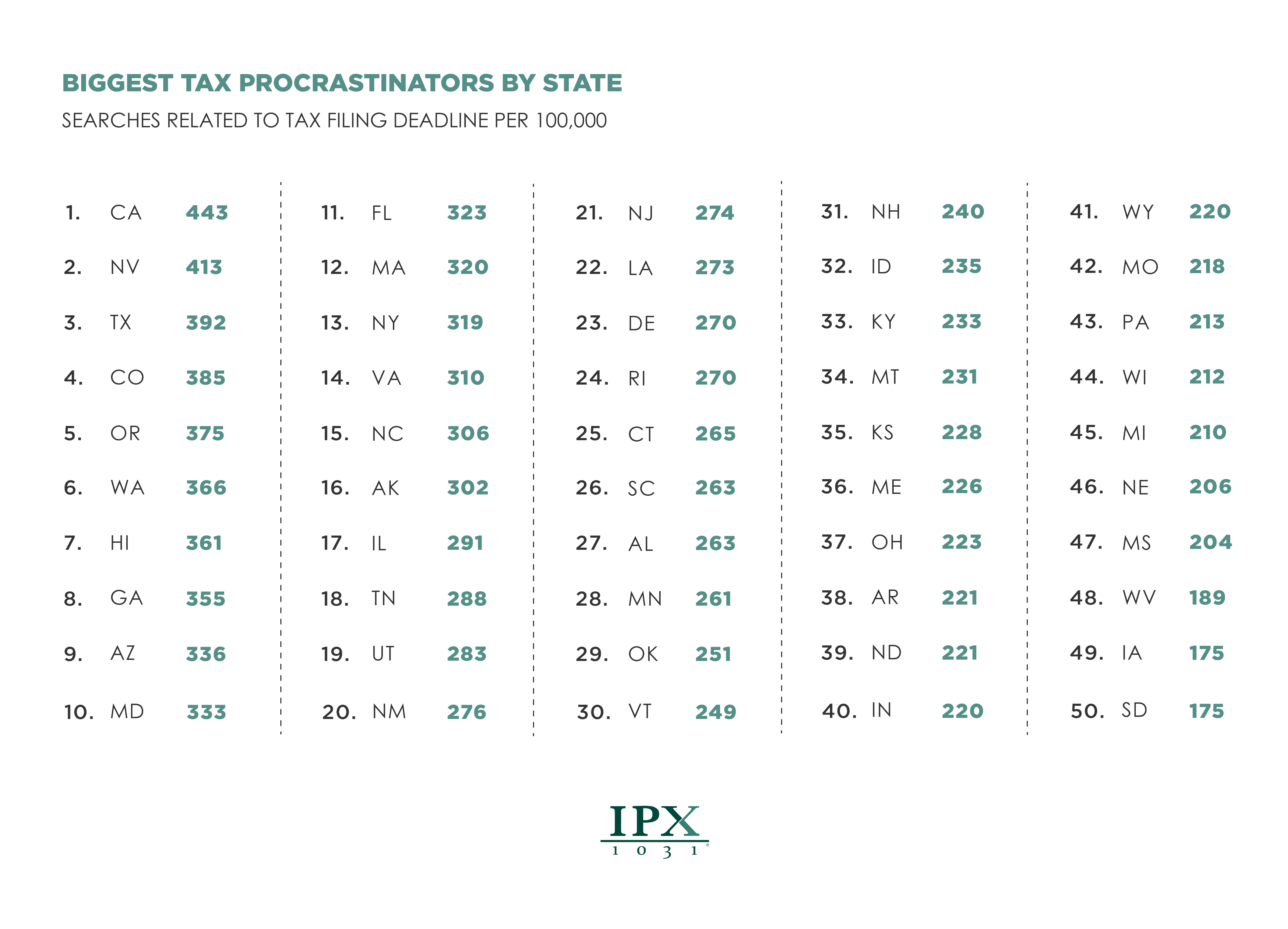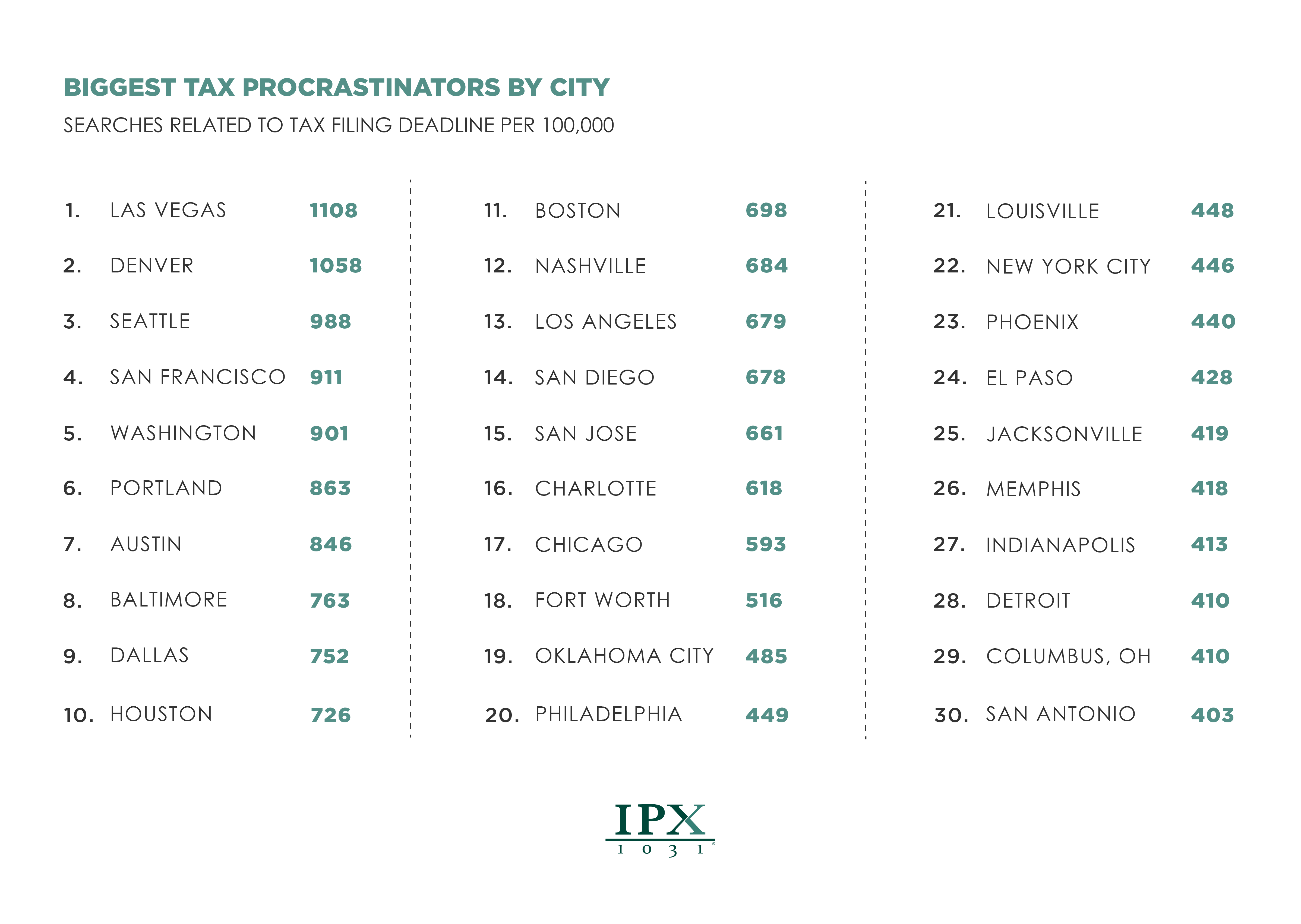 We were curious to find out where America’s biggest procrastinators are when it comes to filing taxes. Using geo-targeted search data, we analyzed Google searches in all 50 states and the 30 largest cities in America during last year’s tax season (January – April 2019). Our analysis included total search volume for phrases and questions related to keywords such as “can I file taxes late,” “need tax extension” and “last day to file taxes” as well variations of those keywords and phrases.