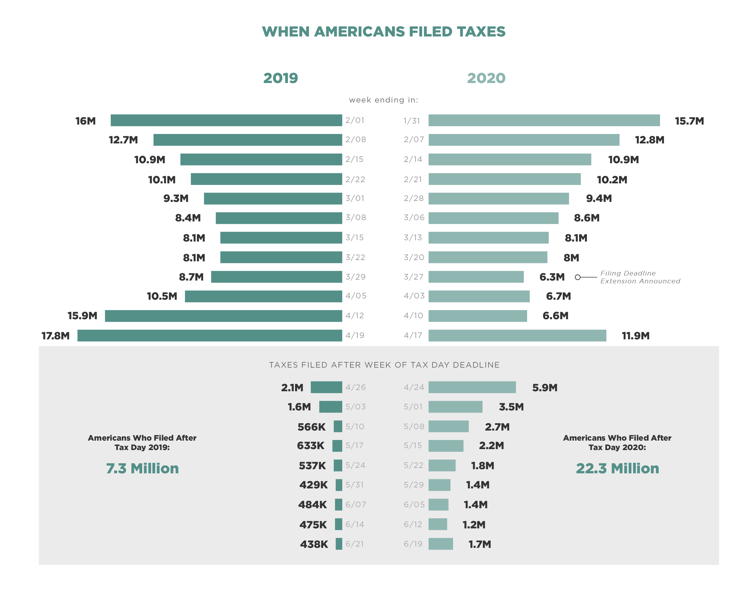 In 2020, Covid-19 led to changes as to when Americans filed their taxes. The IRS and Treasury Department pushed the original Tax Day of April 15 to July 15. In fact, during the week that the filing extension announcement was made, 2.4 fewer Americans filed their taxes compared to the same filing week in 2019. One of the biggest year-over-year drops in filings occurred the week ending in April 10. Compared to the same week in 2019, 9.3 fewer Americans filed their taxes.