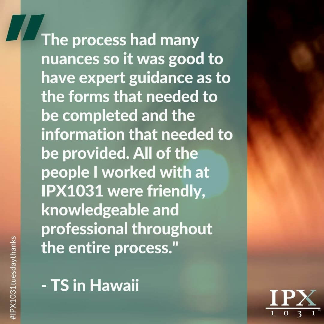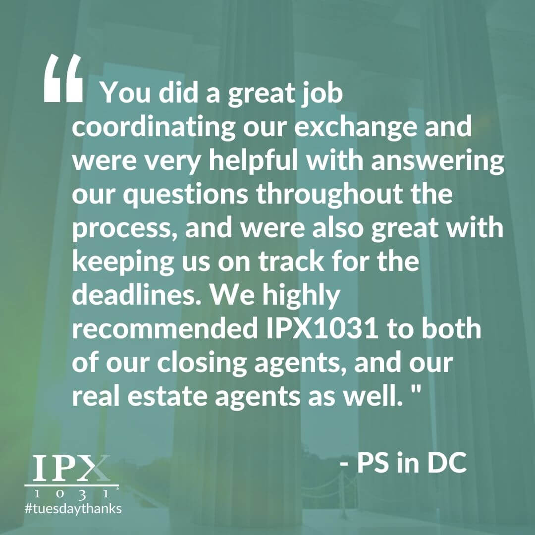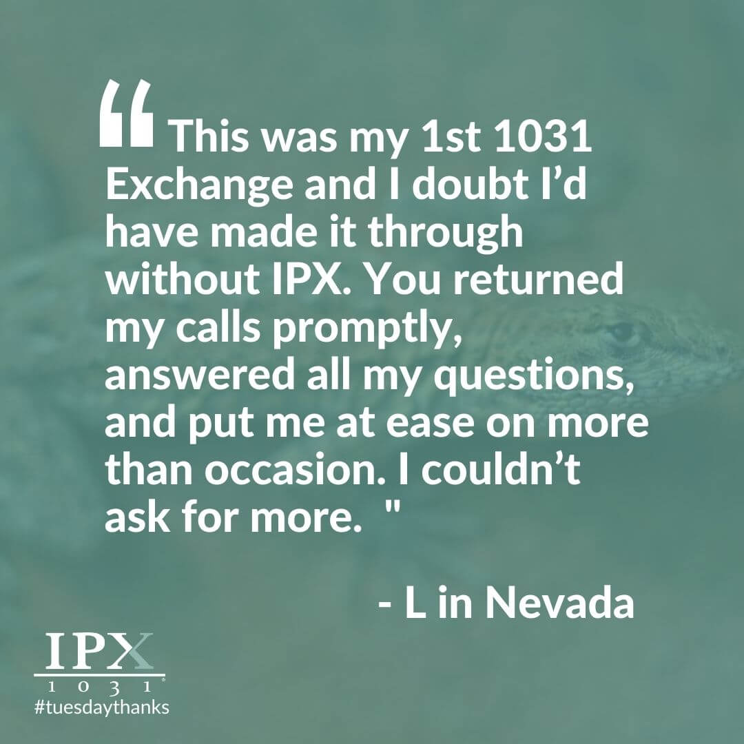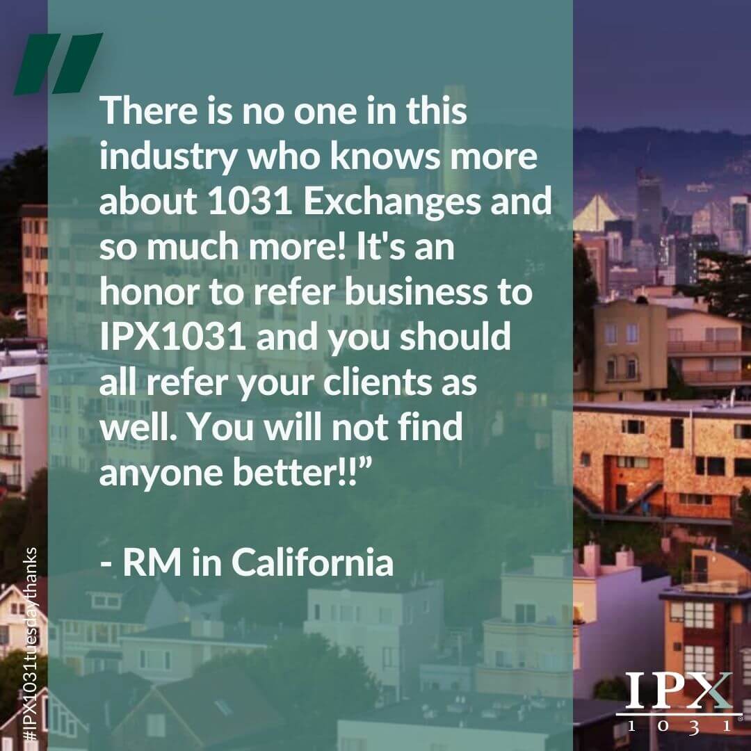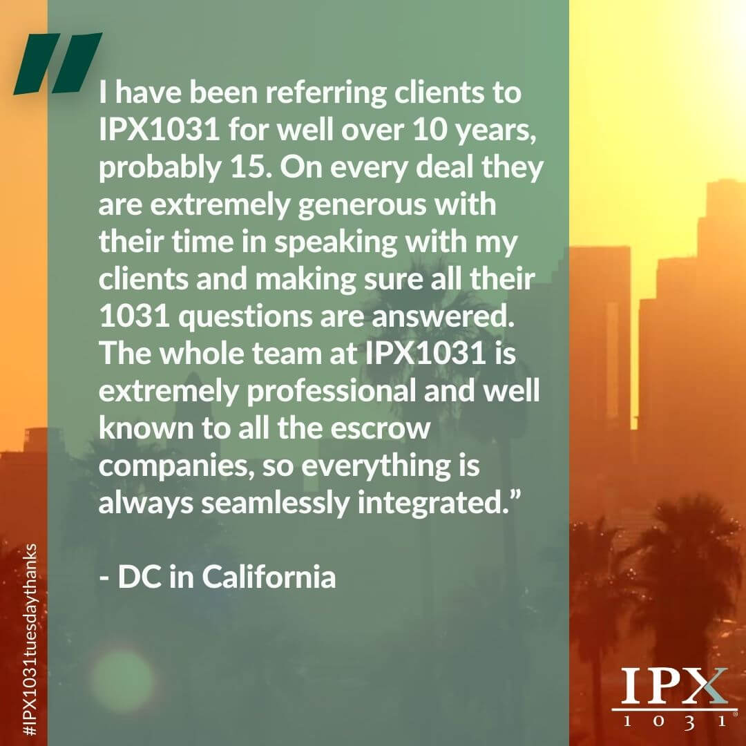 Welcome to our ‘Tuesday Thanks’ series, where every Tuesday, we express our gratitude by sharing heartfelt testimonials from clients who’ve experienced the exceptional service and success of IPX1031 in their 1031 Exchange journeys. Join us in celebrating the stories that inspire us and showcase the trust our clients place in our expertise and dedication.