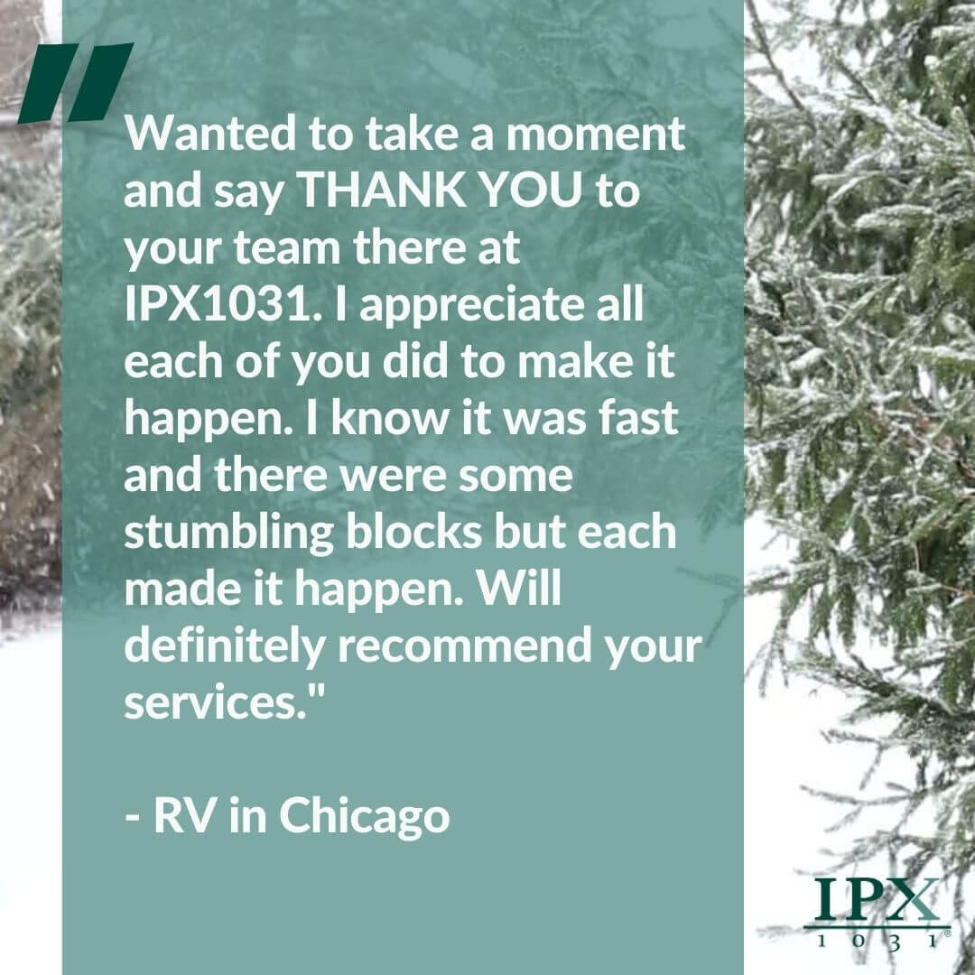 We are so pleased and appreciative of IPX1031 as our intermediary. They are professional, thorough, responsive, and careful. IPX1031 has a great reputation. Thank you IPX1031.