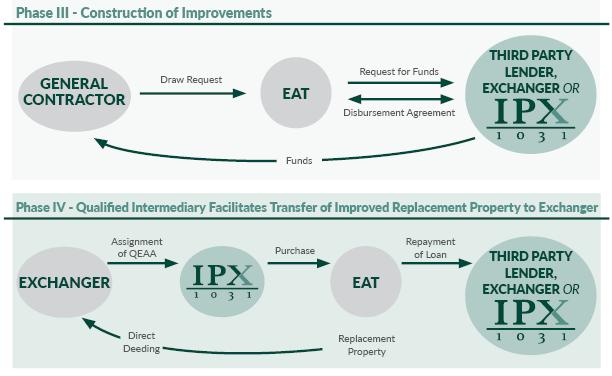 As in a typical Delayed Exchange, the Build-to-Suit Exchange involves a Qualified Intermediary and begins when the Exchanger sells the Relinquished Property. Prior to closing on the purchase of the Replacement Property, the Exchanger enters into a Qualified Exchange Accommodation Agreement (QEAA) with the EAT and assigns its rights in the purchase contract to the EAT. The EAT then acquires title to the Replacement Property. IPX1031 holds all parked properties in a separate special purpose holding entity (typically a single member LLC) for each exchange (the EAT and holding entity are jointly referred to as the EAT). The Exchanger or its designated representative is authorized by the EAT to act as its project manager to oversee all aspects of the construction. During the 180-day exchange period, the Exchanger, as project manager, sends construction invoices to the EAT for payment. The EAT must make payments directly to the vendors.