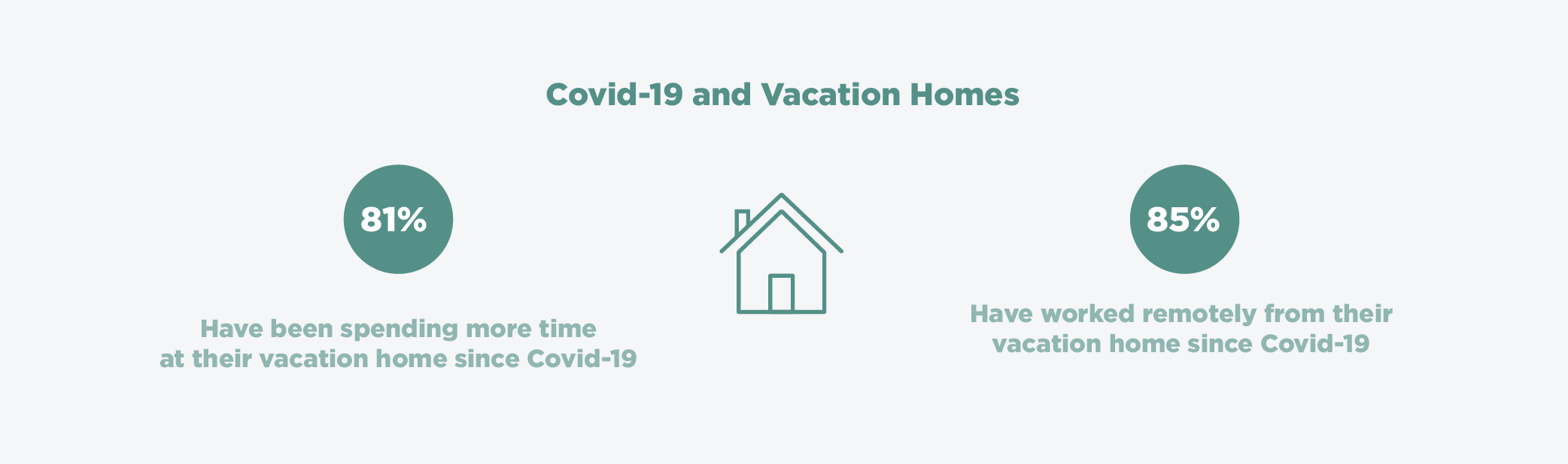 Overall, 81% of vacation homeowners said they’re spending more time at their property since Covid-19. This extra time is not only being spent relaxing, but also working. According to respondents, 85% said they’ve used their vacation home to work remotely since the pandemic began.