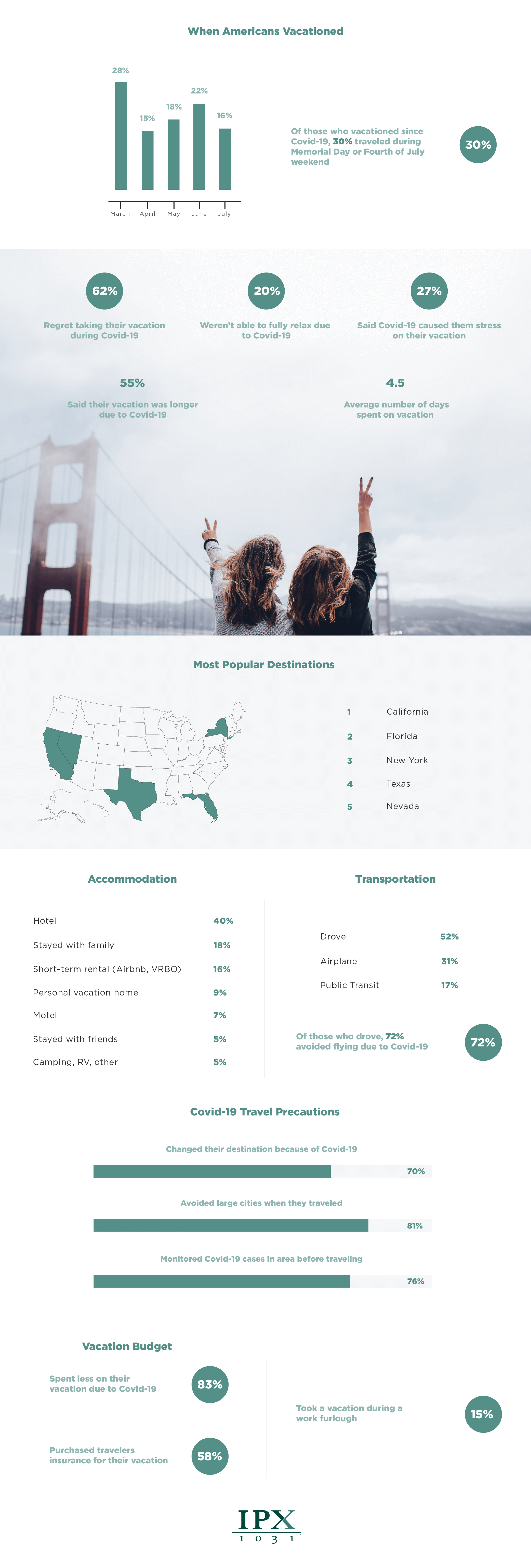 Travelers also were adaptable to the pandemic as 70% said they changed their destination due to the virus and 81% avoided large cities. As an extra precaution, 58% purchased travelers insurance for their vacation.